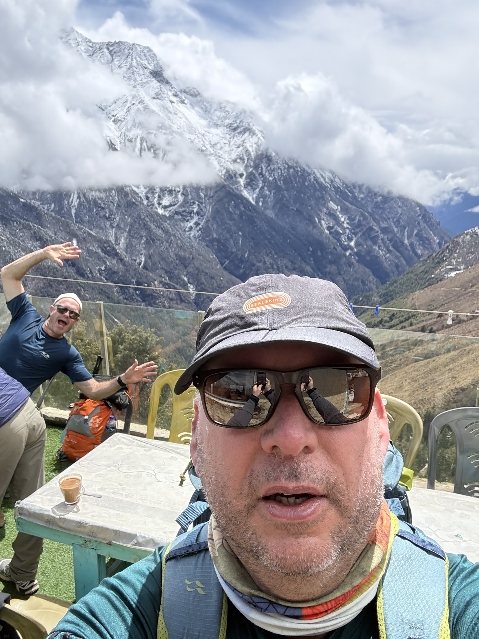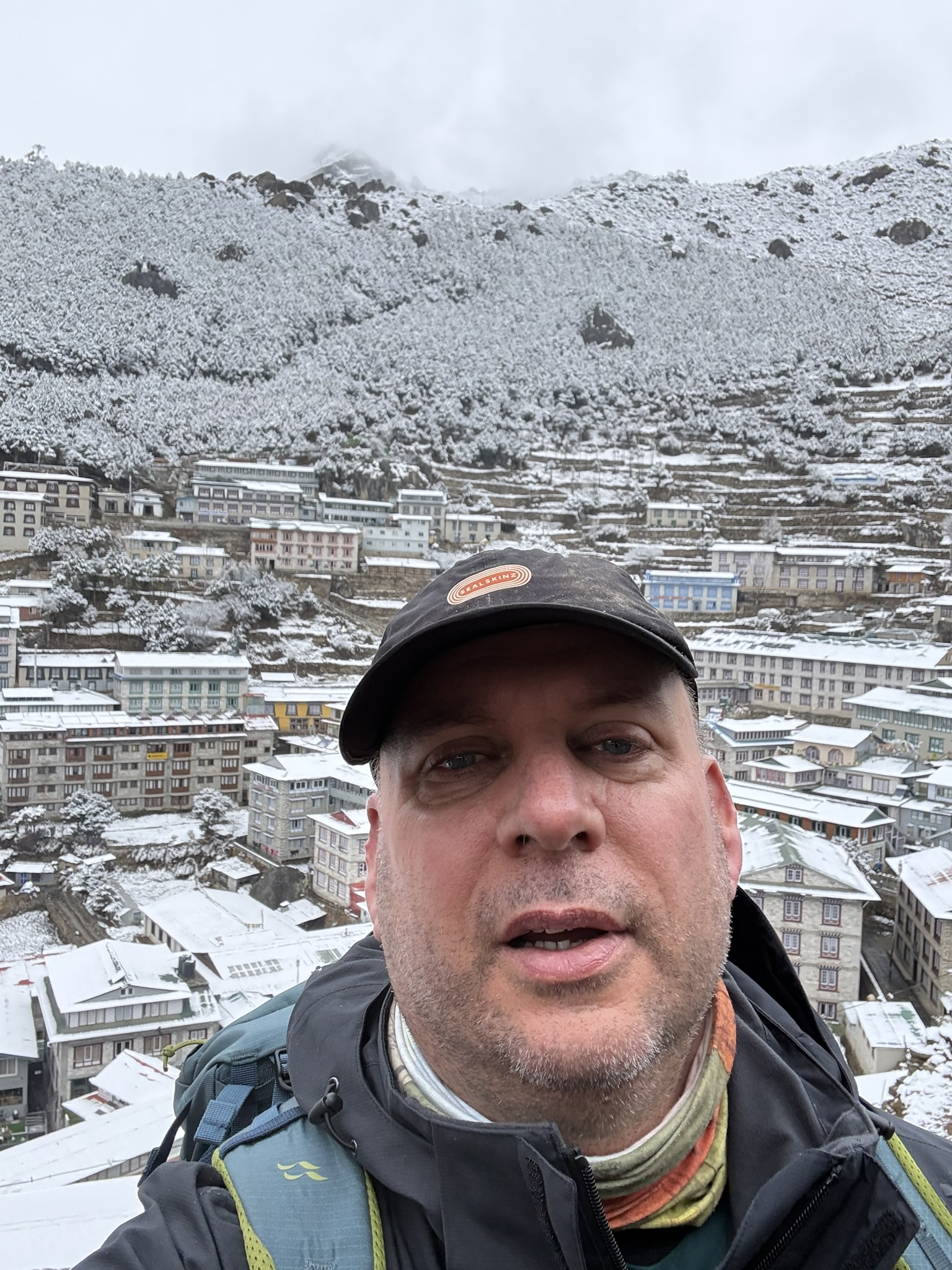 Now if the Nepalese say it’s a steep ascent to Namche Bazaar from the bridge you should realise it’s a million steps and very steep and exhausting due not only the intensity of the walk but also rapidly increasing altitude. Just to add to the mix on a sunny day like this morning you can see Everest and surrounding mountain peaks, great, however the weather had turned, lots of cloud and it started to snow.