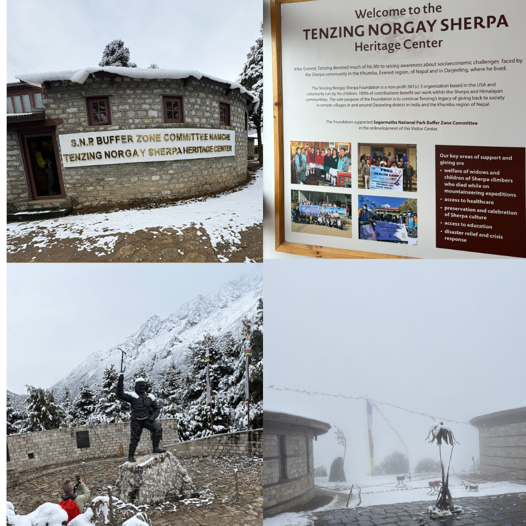 It’s an acclimatisation trek today and only 5 hours including a break. Early start and breakfast, its snowing when we start and cold, so layers on. As a short walk 45 mins straight up a steep walk to the Tenzing Norgay and Everest museum. We spend time here which is a great first insight to the Sherpas and there history along with the tourism and changes to Nepal. Can see very little other than cloud and snow.